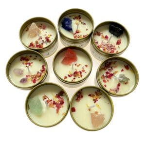 The cup-shaped design of these candles adds an elegant touch to any room. At the same time. the combination of natural rough crystals. dried flowers. and essential oil-scented soy wax provides a soothing aromatherapy experience.